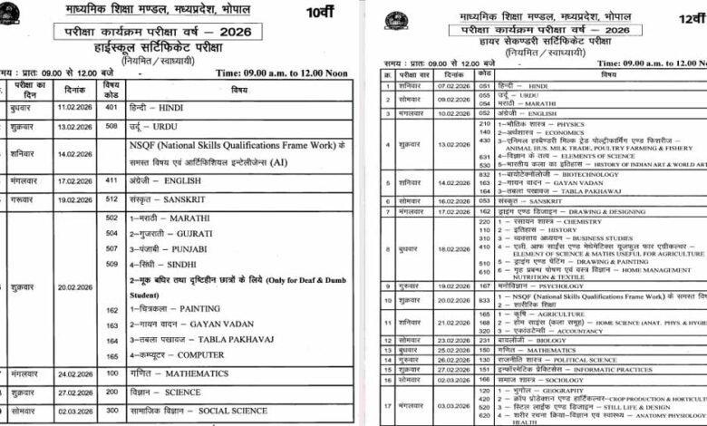 मध्य प्रदेश माध्यमिक शिक्षा मंडल की ओर से जारी टाइम टेबल के अनुसार, दोनों कक्षाओं का पहला पेपर हिंदी विषय का होगा। टाइम टेबल के अनुसार, 12वीं की परीक्षाएं 7 फरवरी से 3 मार्च 2026 तक चलेंगी। वहीं 10वीं की परीक्षाएं 11 फरवरी से 2 मार्च तक चलेंगी। परीक्षा का समय सुबह 9 बजे से लेकर 12 बजे तक निर्धारित है।