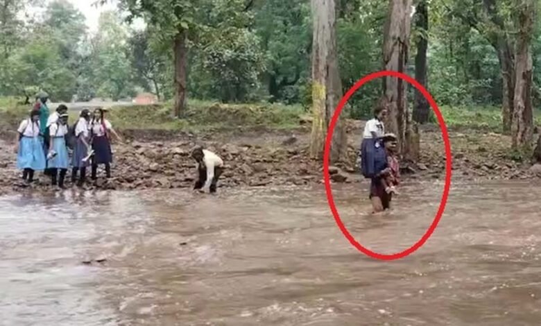 तेज बारिश के कारण नदी का जलस्तर बढ़ने से बच्चे घंटों तक नदी किनारे फंसे रहे. बारिश में भीगते हुए खड़े मासूम बच्चों को देखकर गांव के कुछ ग्रामीणों ने अपनी जान की परवाह न करते हुए बारी-बारी से उन्हें नदी पार कराया.