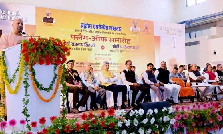 राजधानी लखनऊ में शनिवार को आत्मनिर्भर भारत का एक नया अध्याय लिखा गया, जब ब्रह्मोस एयरोस्पेस लिमिटेड की लखनऊ इकाई में उत्पादित सुपरसोनिक ब्रह्मोस मिसाइलों के पहले बैच का फ्लैग ऑफ केंद्रीय रक्षा मंत्री राजनाथ सिंह और मुख्यमंत्री योगी आदित्यनाथ ने किया। भारत माता की जय’ के जयघोष के बीच जब मिसाइलों का पहला जत्था रवाना हुआ तो समारोह गर्व, गौरव और देशभक्ति से गूंज उठा। कार्यक्रम को संबोधित करते हुए मुख्यमंत्री योगी आदित्यना ने कहा कि ब्रह्मोस केवल भारत की नहीं, बल्कि पूरी दुनिया में अपने मित्र देशों की रक्षा करने का सबसे सक्षम हथियार है। उन्होंने कहा कि रक्षा मंत्री राजनाथ सिंह के प्रयास से ब्रह्मोस लखनऊ में विकसित हुआ है, जो देश की खुशहाली का माध्यम बना है। जब व्यक्ति सुरक्षित रहता है, तभी चैन की नींद सोता है। लखनऊ में बनी मिसाइल पूरे देशवासियों की सुरक्षा और समृद्धि की गारंटी है।