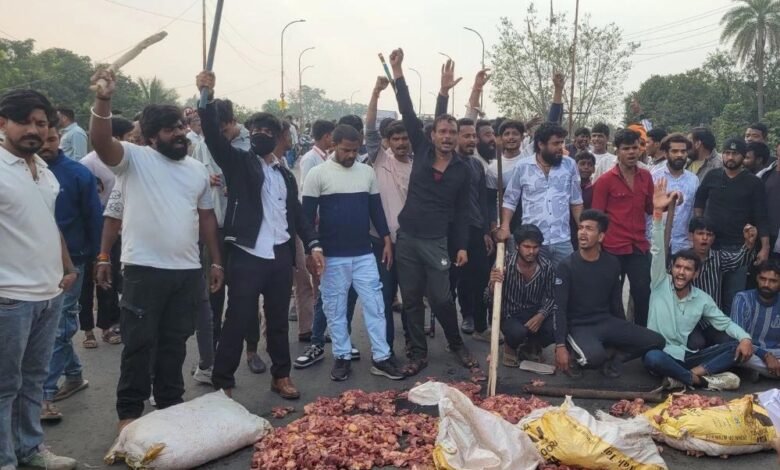 गोमांस को सड़क पर रख कर जाम किया रास्ता