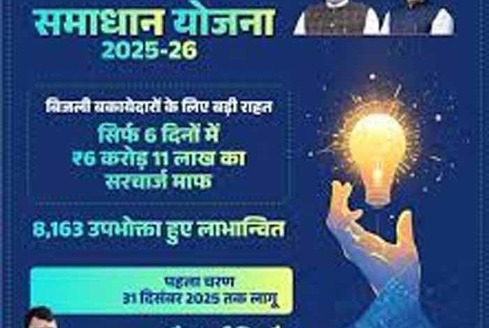 विगत 3 नवंबर से शुरू हुई समाधान योजना 2025-26 का लाभ लाखों बकायादार उपभोक्ता उठा रहे हैं। कंपनी के प्रबंध संचालक श्री क्षितिज सिंघल ने उपभोक्ताओं से अपील की है कि तीन माह से अधिक के बकायादार उपभोक्ता योजना के प्रथम चरण में ही अपना बकाया बिल एकमुश्त जमा करके सौ फीसदी तक सरचार्ज माफी का लाभ उठा सकते हैं। मध्य प्रदेश सरकार की समाधान योजना 2025-26 का प्रथम चरण चल रहा है, जोकि 31 दिसंबर 2025 को समाप्त होगा। इस दौरान बकायादार उपभोक्ताओं को सरचार्ज में अधिकतम छूट का लाभ मिल रहा है। हालांकि 1 जनवरी से 28 फरवरी 2026 तक दूसरा चरण चलेगा, लेकिन उसमें सरचार्ज माफी का प्रतिशत कम हो जाएगा, इसलिए प्रथम चरण में ही योजना में शामिल होकर अधिकतम लाभ उठाएं। अब तक मध्य क्षेत्र विद्युत वितरण कंपनी के 2 लाख 46 हजार 372 बकायादार उपभोक्ताओं ने अपना पंजीयन कराकर लाभ लिया है। मध्य क्षेत्र विद्युत वितरण कंपनी के खाते में 255 करोड़ 53 लाख से अधिक की मूल राशि जमा हुई है, जबकि 133 करोड़ 40 लाख का सरचार्ज माफ किया गया है।