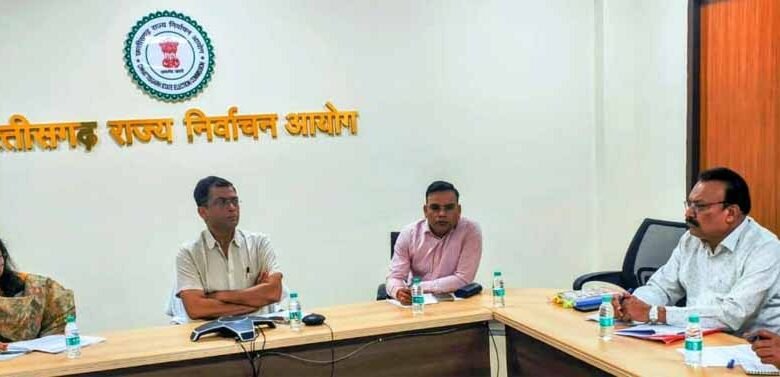 राज्य निर्वाचन आयुक्त अजय सिंह की अध्यक्षता में छत्तीसगढ़ राज्य निर्वाचन आयोग में आज एक महत्वपूर्ण बैठक आयोजित की गई। बैठक में छत्तीसगढ़ के मुख्य निर्वाचन पदाधिकारी यशवंत कुमार तथा राज्य निर्वाचन आयोग की सचिव मती शिखा राजपूत तिवारी सहित वरिष्ठ अधिकारीगण उपस्थित थे