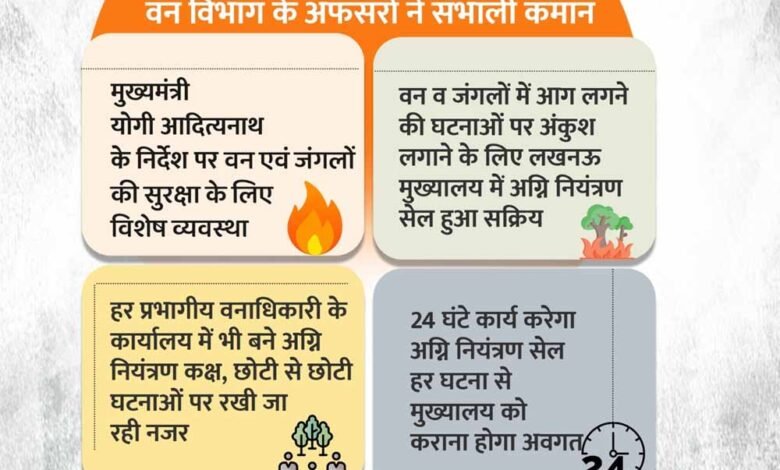 मौसम में परिवर्तन के साथ ही मुख्यमंत्री योगी आदित्यनाथ के निर्देश पर वन विभाग ने आग से बचाव की तैयारी पूरी कर ली है। मुख्यमंत्री ने वन विभाग के आलाधिकारियों से कहा है कि गर्मी में जंगलों में आग की घटनाएं न हों, इसके लिए अभी से तैयार रहें। वन विभाग ने ऐसी घटनाओं पर निगरानी और रोकथाम के लिए मुख्यालय से लेकर प्रभागीय स्तर, जोनल-मंडलीय मुख्य वन संरक्षक स्तर पर नियंत्रण कक्ष बनाया है। प्रदेश मुख्यालय पर बनाए गए अग्नि नियंत्रण सेल कार्य कर रहे हैं।