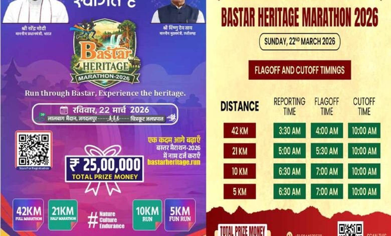 छत्तीसगढ़ में खेलों को बढ़ावा देने और बस्तर की सांस्कृतिक विरासत को राष्ट्रीय मंच पर लाने के उद्देश्य से “बस्तर हेरिटेज मैराथन 2026” का आयोजन किया जा रहा है। मुख्यमंत्री विष्णु देव साय के नेतृत्व में यह आयोजन राज्य के लिए एक ऐतिहासिक पहल माना जा रहा है। 22 मार्च को आयोजित होने वाली यह मैराथन जगदलपुर के लालबाग मैदान से प्रारंभ होकर चित्रकोट जलप्रपात तक पहुंचेगी। यह रूट प्रतिभागियों को बस्तर के प्राकृतिक और ऐतिहासिक सौंदर्य से रूबरू कराएगा।