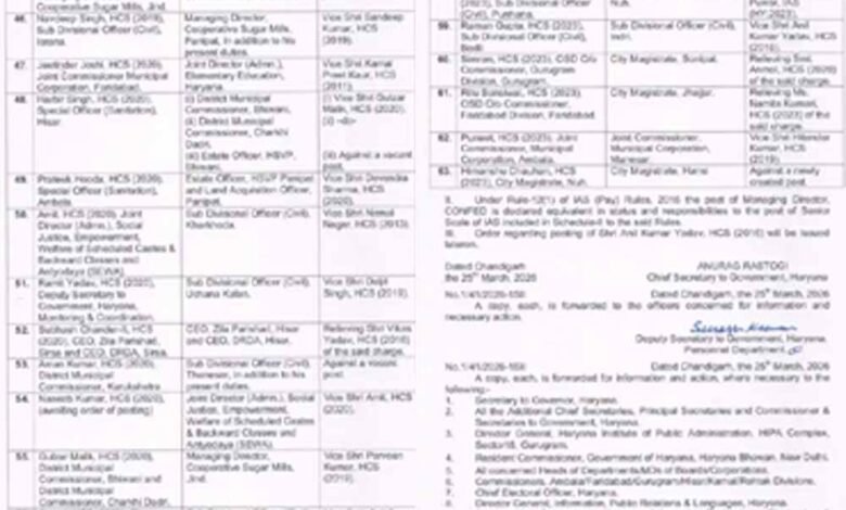 हरियाणा प्रशासन में हलचल: 21 IAS व 42 HCS अधिकारियों का तबादला, सिस्टम सुधार पर फोकस