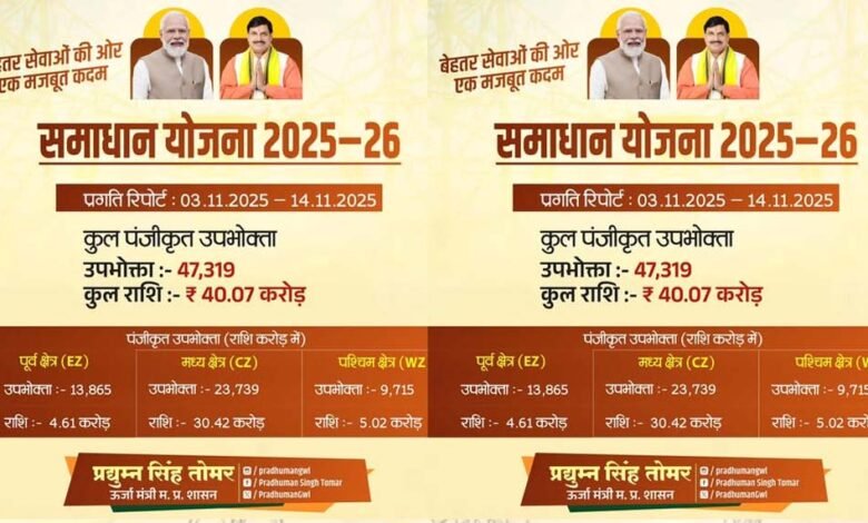 ऊर्जा मंत्री प्रद्युम्न सिंह तोमर ने बताया है कि समाधान योजना में अब तक 25 लाख 75 हजार बिजली उपभोक्ताओं में सरचार्ज में छूट का लाभ लिया है। उन्होंने कहा है कि मध्यप्रदेश सरकार की समाधान योजना 2025-26 के द्वितीय व अंतिम चरण को 31 मार्च 2026 तक बढ़ा दिया गया है। पूर्व में यह योजना 28 फरवरी तक लागू थी। उल्लेखनीय है कि पिछले वर्ष 3 नवम्बर को समाधान योजना 2025-26 की शुरुआत हुई थी। समाधान योजना में तीन माह से अधिक के बकायादार उपभोक्ताओं को एकमुश्त राशि जमा करने पर 90 प्रतिशत तक सरचार्ज में छूट का लाभ दिया जा रहा है। मंत्री तोमर ने उपभोक्ताओं से अपील की है कि यदि वे तीन माह से अधिक के बकाएदार हैं और योजना में अभी तक शामिल नहीं हो पाए वे अब 31 मार्च तक योजना में शामिल होकर अपना बकाया बिल एकमुश्त जमा करके 90 फीसदी तक सरचार्ज माफी का लाभ उठा सकते हैं।