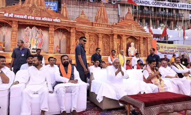 भाजपा के राष्ट्रीय अध्यक्ष नितिन नवीन ने मंच पर मौजूद सभी नेताओं का गर्मजोशी से स्वागत किया। मुख्यमंत्री नीतीश कुमार और नितिन नवीन द्वारा वहां पहुंच रही झांकियों को सम्मानित किया जा रहा है। नीतीश कुमार के मंच पर चढ़तेही जय श्री राम के नारे लगने लगे।