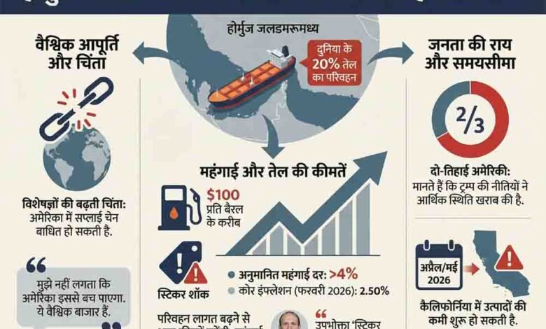 अभी फरवरी 2026 में अमेरिका की महंगाई (कोर इंफ्लेशन) दर 2.50 फीसदी थी , लेकिन युद्ध के कारण तेल की कीमतें 100 डॉलर प्रति बैरल के करीब बनी हुई हैं. पीटरसन इंस्टीट्यूट की विशेषज्ञ गैरी हुफबॉर का अनुमान है कि ईरान युद्ध के कारण महंगाई 4 प्रतिशत या उससे भी अधिक हो सकती है. सीएनएन के एक हालिया सर्वे के अनुसार, लगभग दो-तिहाई अमेरिकी नागरिकों का मानना है कि राष्ट्रपति डोनाल्ड ट्रंप की नीतियों ने आर्थिक स्थितियों को खराब किया है. जेपी मॉर्गन की एक रिपोर्ट कहती है कि अमेरिका तेल की कमी से प्रभावित होने वाला अंतिम बाजार होगा, लेकिन कैलिफोर्निया में अप्रैल के अंत या मई से उत्पादों की कमी शुरू हो सकती है.