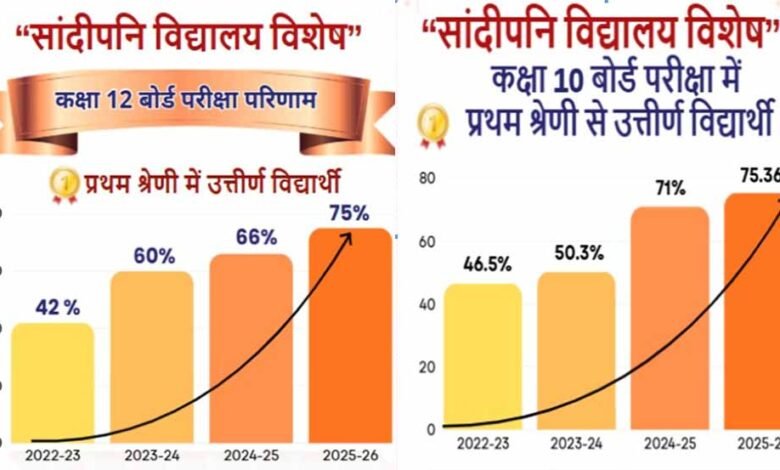 वर्ष 2026 में कक्षा 10 की राज्य स्तरीय मेरिट सूची में जहां 41 विद्यार्थी सांदीपनि विद्यालयों से हैं, वहीं कक्षा 12 में विज्ञान, वाणिज्य, कला और कृषि संकायों की मेरिट सूची में 17 विद्यार्थियों का चयन हुआ है।